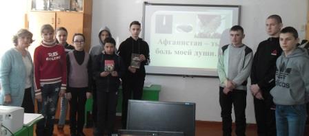 15 февраля отмечается 30 лет со дня вывода ограниченного контингента советских войск из демократической республики Афганистан. Патриотическое воспитание подрастающего поколения всегда являлось одной из важнейших задач современной школы, ведь детство и юность – самая благодатная пора для привития священного чувства любви к Родине. Программа работы школы по патриотическому воспитанию направлена на неустанную работу по созданию у школьников чувства гордости за свою Родину и свой народ, уважения к его свершениям и достойным страницам прошлого. Урок мужества «Афганистан-ты боль моей души...» прошел в Ивано-Кувалатской средней школе. Учитель истории Усманова Елена Владиславовна познакомила ребят с историческими событиями в Афганистане, рассказала о том, как мужественно и профессионально выполняли свой долг наши солдаты, как в сложнейших условиях проявляли мужество, стойкость, благородство, сохраняли верность военной присяге и долгу. Вниманию учащихся была представлена презентация о воинах-интернациолистах села Ивано-Кувалат. Библиотекарь Иванова Т.И. познакомила с поэзией и песнями посвященными Афганской войне.